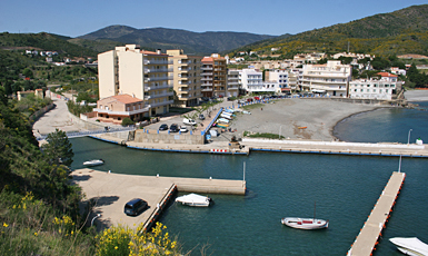 Vista del petit port i de la Platja de les Portes |