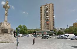 En l'actualitat, la Plaça del Lleó entre l'avinguda General Mendoza, carrer Ultònia i l'inici del carrer de la Rutlla, amb l'edifici " ----" al fons |